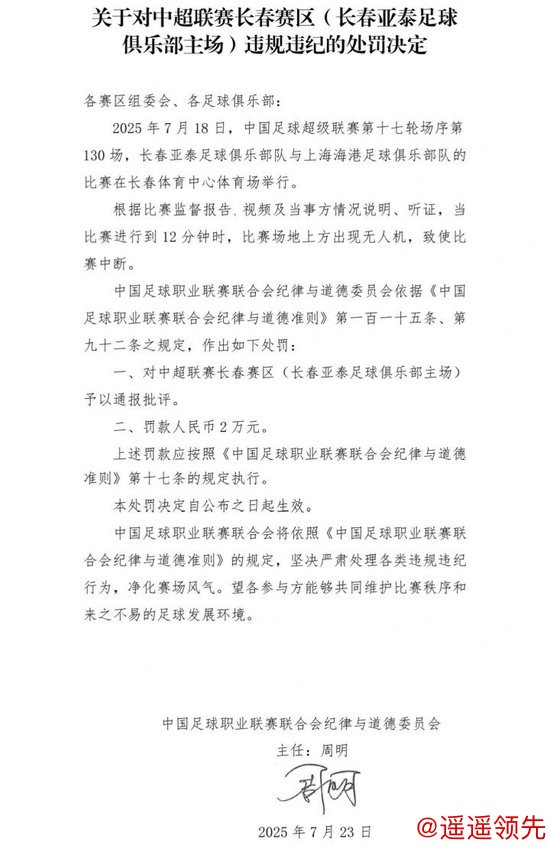 07月24日讯 据中国足球职业联赛联合会官网消息,长春亚泰因第17轮中超主场对阵上海海港的比赛中出现无人机,开云体育下载皇冠体育被罚款人民币2万元皇冠体育,并被通报批评。